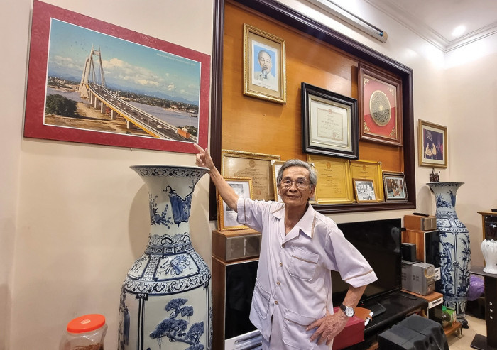 Anh hùng lao động Vũ Đức Thiện cùng hình ảnh cầu Bính ( nguồn ảnh Báo giao thông)