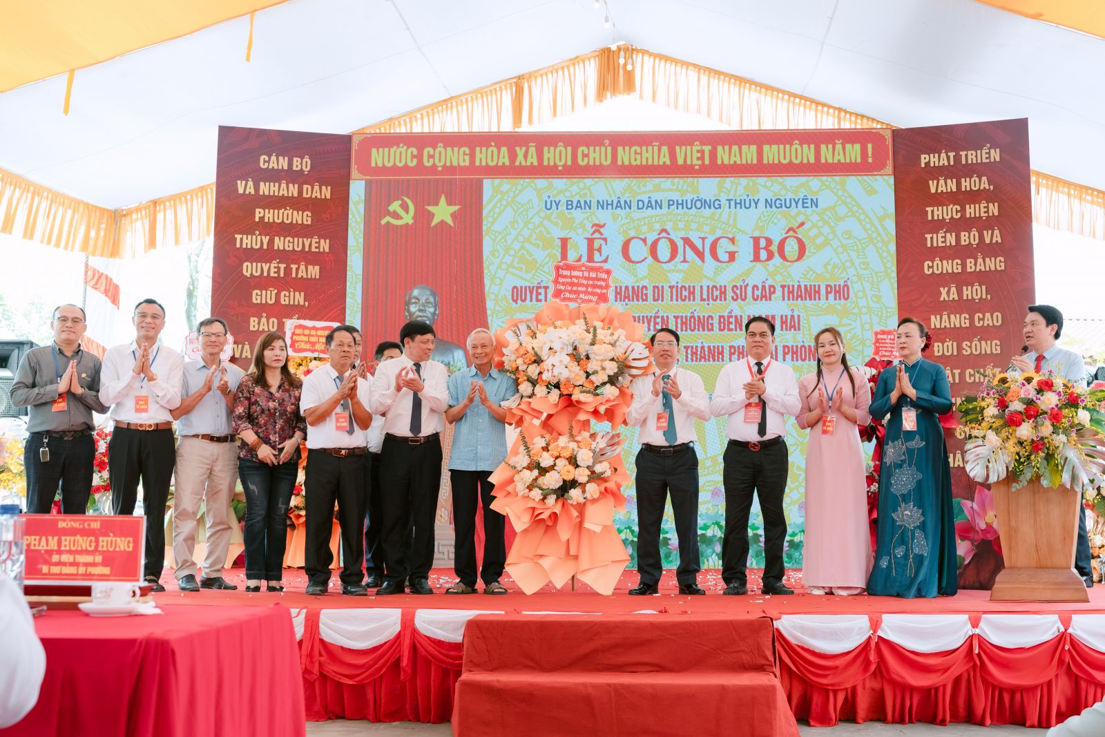 Ông Phạm Hưng Hùng – UVTU, Bí thư Đảng ủy phường Thủy Nguyên lên tặng hoa cho Tiểu ban quản lý di tích.