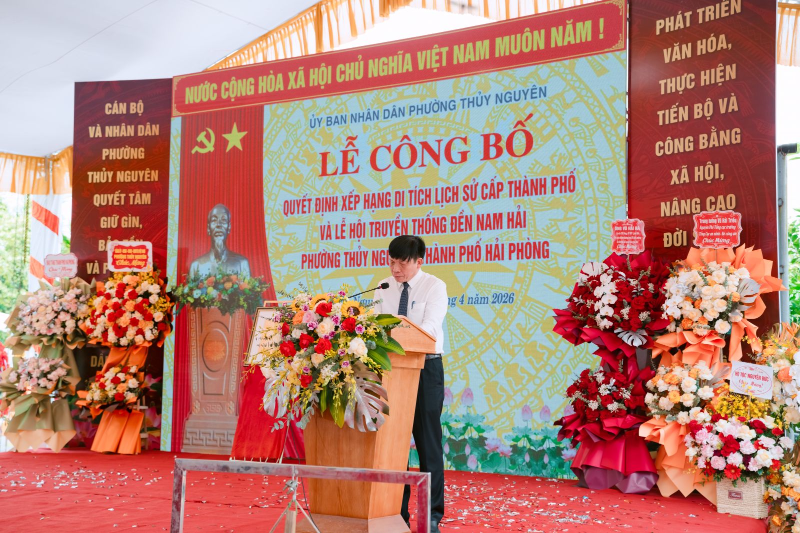 Phát biểu tại buổi lễ, ông Nguyễn Văn Viển – Phó Bí thư Đảng ủy, Chủ tịch UBND phường Thủy Nguyên nhấn mạnh: việc Đền Nam Hải được xếp hạng di tích lịch sử cấp thành phố là sự ghi nhận xứng đáng đối với những giá trị lịch sử, văn hóa, kiến trúc và tín ngưỡng tiêu biểu của di tích; đồng thời thể hiện sự quan tâm của thành phố đối với công tác bảo tồn và phát huy di sản văn hóa trên địa bàn. Đồng chí khẳng định, đây không chỉ là niềm vinh dự, tự hào của Đảng bộ, chính quyền và Nhân dân địa phương, mà còn đặt ra trách nhiệm ngày càng cao trong công tác quản lý, bảo tồn và phát huy giá trị di tích trong thời gian tới.